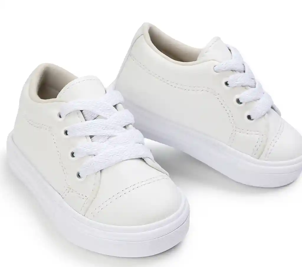 Tenis blanco para niños / Niñas Talla 23. Medida interna de la plantilla 15 Cm. Zapatillas blancas Unisex combinan diseño minimalista y comodidad, confeccionadas en materiales resistentes, suela antideslizantede caucho costuras reforzadas y cordones ajustables para un calce seguro. Ideales para uniformes escolares, actividades diarias. Estilo Limpio y moderno.