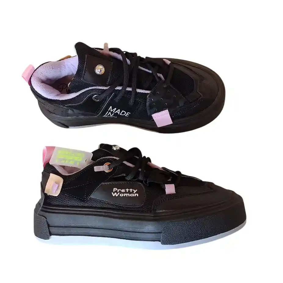 Tenis color Negro con detalles Rosa y Morado Talla 34. Tenis Color Negro Con Detalles Rosa Y Morado con cordones. Zapatos completamente nuevos. Talla 34