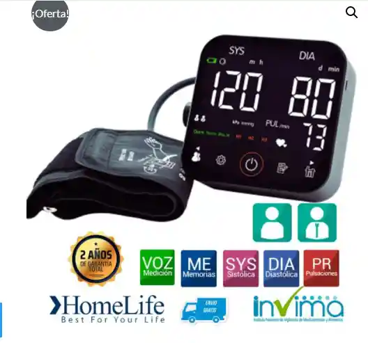 Monitor de presión sanguínea automático para uso de personas mayores de 12 años, este instrumento médico realiza la medición de la presión arterial sistólica, diastólica y la frecuencia de pulso cardíaco. Detección de arritmias cardíacas e indicador de clasificación de la Organización Mundial de la salud (OMS). Función de voz al realizar las tomas de presión. Sistema de recarga con batería de litio 3.7 V, 1.800 mA. Los valores se leen en una pantalla LCD. Se utiliza como equipo de diagnóstico primario y monitoreo en pacientes adultos con alteraciones cardíacas. Equipo con registro INVIMA vigente. Tensiómetro de brazo digital Home Life Master con medición sistólica, diastólica, pulsaciones, voz y 120 Memorias. Características: – Uso para niños y para adultos. – 120 Memorias. – Recargable. – 3 parámetros de medición: sistólica, diastólica y pulsaciones. -Detección de la arritmia del BHI.