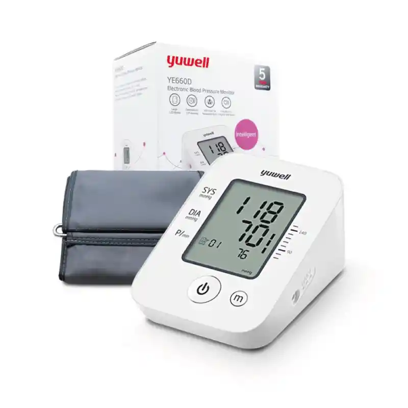 Tensiometro digital Yuwell YE660D con 90 Memorias El tensiómetro digital Yuwell YE660D es un dispositivo médico avanzado diseñado para medir con precisión la presión arterial y las pulsaciones en el brazo. Este innovador tensiómetro está equipado con sensores que detectan el pulso arrítmico y el movimiento excesivo que podría afectar la exactitud de las mediciones. Además, ofrece una gran pantalla LCD, asegurando que los resultados sean fáciles de leer y entender. Con una capacidad de almacenamiento de hasta 90 memorias, podrás realizar un seguimiento efectivo de tus mediciones a lo largo del tiempo. El YE660D incluso te muestra el promedio de las últimas 3 mediciones para un análisis más completo. Este tensiómetro es sinónimo de facilidad: simplemente coloca el brazalete, presiona un botón y obtén resultados rápidos y precisos. Ya sea para uso doméstico o hospitalario, el YE660D es la elección perfecta.