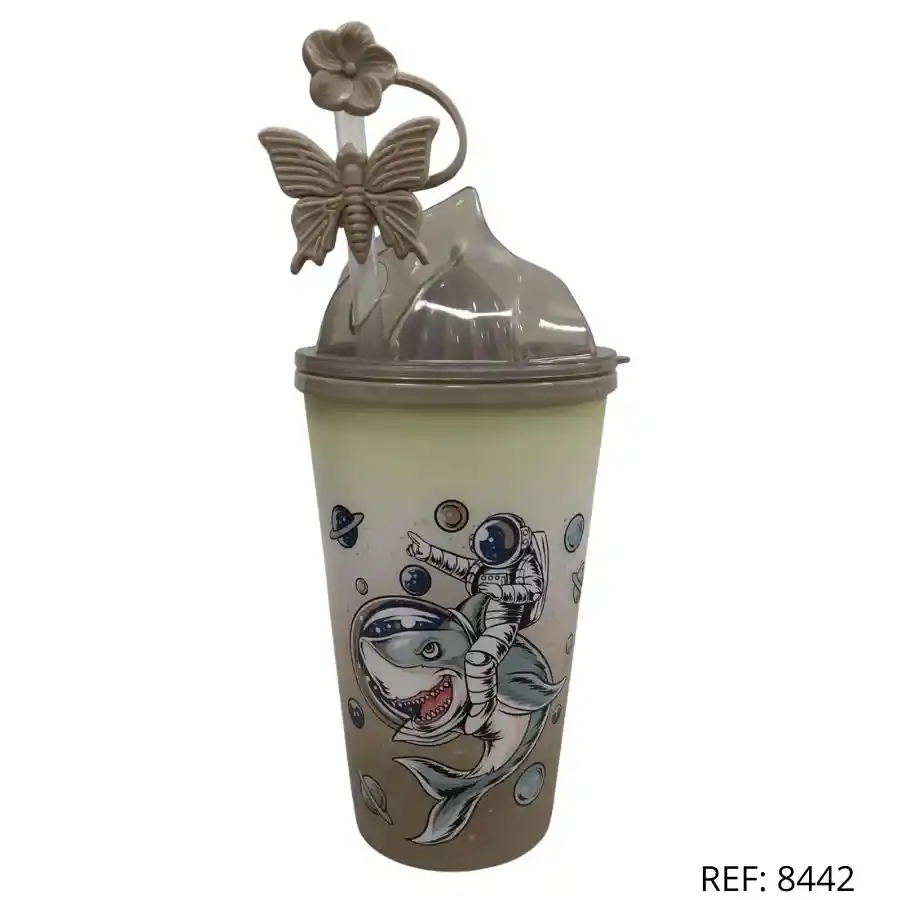 Vaso con astronauta montando tiburón espacial. Incluye sorbete con mariposa, ¡súper original!