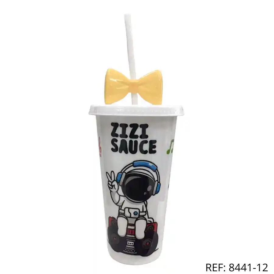 Vaso DJ astronauta con moño amarillo. ¡Perfecto para los amantes del ritmo y el espacio!