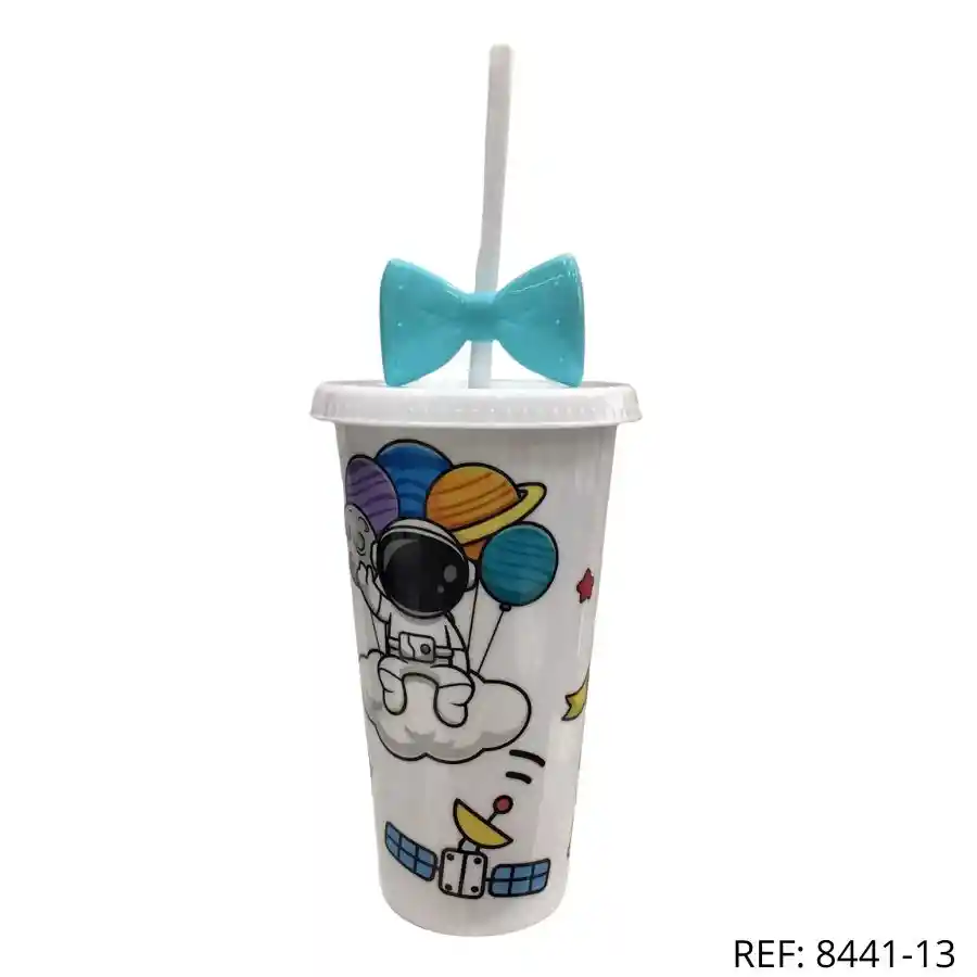 Vaso con astronauta flotando en nubes y globos planetarios. Moño azul, diseño adorable.