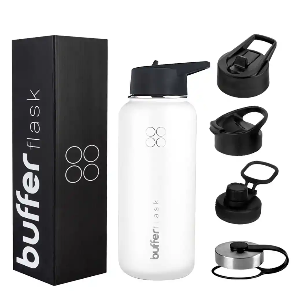 ¡Mantén la temperatura dentro de tu botella con Buffer de 950 ml! - Sabemos que es importante la temperatura dentro de tu botella, por eso tu botella térmica Buffer se mantiene ¡24 horas fría y 12 horas caliente! - Incluye 4 tapas diferentes, para las puedas intercambiar según tus necesidades. - Su doble pared aislada al vacío, permite mantener la temperatura de los líquidos por mayor tiempo y al evitar la transferencia de temperatura elimina el riesgo de quemarte al portar líquidos calientes. - Tu botella buffer no suda! No te volverás a encontrar con objetos o superficies mojadas alrededor. - Fácil de lavar y no retiene olores. --------------------------------------------------------- FICHA TÉCNICA - Botella con 4 tapas para elegir Buffer - Capacidad: 950 ml - Libres de BPA - Material Interior: Acero 100% inoxidable 304 - Material Exterior: Revestimiento de cobre - Colores: Negro, Morado y Verdigris - Medidas boca botella: 6 cm - Medidas: 23,5 x 9 cm - Peso: 430 gr --------------------------------------------------------- QUE VIENE EN LA CAJA - 1 Botella térmica Buffer de 950 ml - 4 tapas para elegir **BUFFER® es distribuida en Colombia y Sudamérica exclusivamente por Builder Commerce SAS** --------------------------------------------------------- PREGUNTAS FRECUENTES: ¿El precio indicado incluye IVA? Si, si incluye IVA el precio publicado. ¿Los productos tienen garantía? Sí. Todos nuestros productos cuentan con 1 año de garantía limitada contra defectos de fabricación.