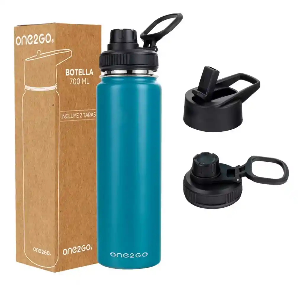 Lleva tus bebestibles favoritos a todos lados con tu botella de 700 ml One2Go - Sabemos que es importante la temperatura dentro de tu botella, por eso tu botella térmica Buffer se mantiene ¡24 horas fría y 12 horas caliente! - Incluye 2 tapas diferentes, para las puedas intercambiar según tus necesidades. - Su doble pared aislada al vacío, permite mantener la temperatura de los líquidos por mayor tiempo y al evitar la transferencia de temperatura elimina el riesgo de quemarte al portar líquidos calientes. - Tu botella One2Go no suda! No te volverás a encontrar con objetos o superficies mojadas alrededor. - Fácil de lavar y no retiene olores. - Práctica y fácil de llevar contigo a todos lados, ideal para utilizar en invierno y verano. --------------------------------------------------------- FICHA TÉCNICA - Botella con 2 tapas para elegir One2Go - Capacidad: 700 ml - Libres de BPA - Material Interior: Acero 100% inoxidable 304 - Material Exterior: Revestimiento de cobre - Colores: Negro, Celeste con Rosa, Morado con Rosado, Azul con Celeste - Medidas boca botella: 6 cm --------------------------------------------------------- QUE VIENE EN LA CAJA - 1 Botella térmica One2Go de 700 ml - 2 tapas para elegir **ONE2GO® es distribuida en Colombia y Sudamérica exclusivamente por Builder Commerce SAS** ----------------------------------------------------------------------- PREGUNTAS FRECUENTES: ¿El precio indicado incluye IVA? Si, si incluye IVA el precio publicado. ¿Los productos tienen garantía? Sí. Todos nuestros productos cuentan con 12 meses de garantía limitada contra defectos de fabricación.