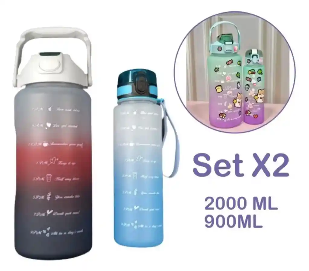 Termo Botella De Agua X 2 Motivacional Mas Sticker 2 Litros Y 900 ML. CARACTERISTICAS: * Set de dos termo botella de 2 Lt y 900 ml. * Cerradura de seguridad. * Seguimiento de su consumo de agua, bebe mas agua sin esfuerzo * Pitillo removible fácil de cargar, de silicona * Evita el polvo: la tapa de polvo con resorte puede evitar eficazmente que el polvo entre en tu botella. * Abre un clic: simplemente abre la boquilla con una sola mano, te ayuda a beber fácilmente. * Boca ancha: la apertura de boca ancha diseñada hace que la botella de agua deportiva sea fácil de llenar con cubitos de hielo y frutas. * Cómoda de transportar: la botella de agua se puede llevar fácilmente a actividades al aire libre, también es adecuada para gym o casa. •Cada Botellita lleva adhesivos para que personalices tu Botilito. DESCRIPCION: - Set de dos lindos y prácticos termos pillos de diferentes medidas para utilizar de acuerdo a la actividad requerida, de 2Lt y 900 ml respectivamente. - Marcador de tiempo motivacional: Esta botella de agua de 2 litros, diseñada con marcadores de tiempo y citas inspiradoras, es perfecta para ayudar a mantenerte motivado a beber suficiente agua durante todo el día. Tiene un diseño transparente y una escala de capacidad que te ayudan a medir tu ingesta diaria de agua de forma fácil y clara. Es la elección perfecta para hacer ejercicio, correr, caminar, andar en bicicleta, acampar, hacer yoga o cualquier otro deporte en casa, el gimnasio, la oficina o al aire libre. - Alta calidad: Hecha de material Tritan ecológico de uso alimentario, las botellas de agua son 100% sin bisfenol A, no tóxica, sin olores, reutilizable, duradero. - La abertura de boca ancha hace que las botellas de agua deportivas sea fácil de llenar con cubitos de hielo y frutas, y el cuerpo con una carcasa especial mate reflectante que reacciona de manera única a tu entorno. - Con lindos stikers para decorar cada una de las botellas y de esta forma personalizarlas a tu gusto. ESPECIFICACIONES: * Termo Botella De Agua 2 Litros. • Termo Botella De Agua 900 ml. * Sticker de diferentes motivos.