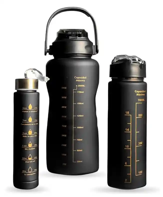 ¡ALCANZA TUS METAS DE HIDRATACIÓN CON ESTILO Y DISCIPLINA! ¿Te cuesta beber suficiente agua durante el día? Con Termo 3 En 1 de Botellas Motivacionales Innovo+, mantenerte hidratado ya no será un reto, sino un hábito elegante y sencillo. Tres tamaños diferentes diseñados para acompañarte en cada momento: desde tu entrenamiento más intenso hasta tu jornada en la oficina. Diseño Motivacional: Cada botella cuenta con marcadores de tiempo y frases inspiradoras en español que te recordarán beber agua constantemente desde las 8:00 AM hasta las 7:00 PM. 3 Tamaños, 3 Soluciones: 2000ml (2 Litros): Perfecta para el hogar o entrenamientos largos. Incluye manija resistente y pitillo de silicona. 1000ml (1 Litro): Ideal para la oficina o el gimnasio. 330ml: Ultra portátil, cabe en cualquier bolso o para los más pequeños. Calidad Premium: Fabricadas en material PC-PP de grado alimenticio, libre de BPA y altamente resistente a impactos. Sellado 100% Hermético: Olvídate de los derrames en tu maleta. Su sistema de cierre de seguridad y empaques de silicona garantizan cero fugas. Apertura de un Toque: Tapa con botón de apertura rápida para que bebas agua con una sola mano mientras haces ejercicio.