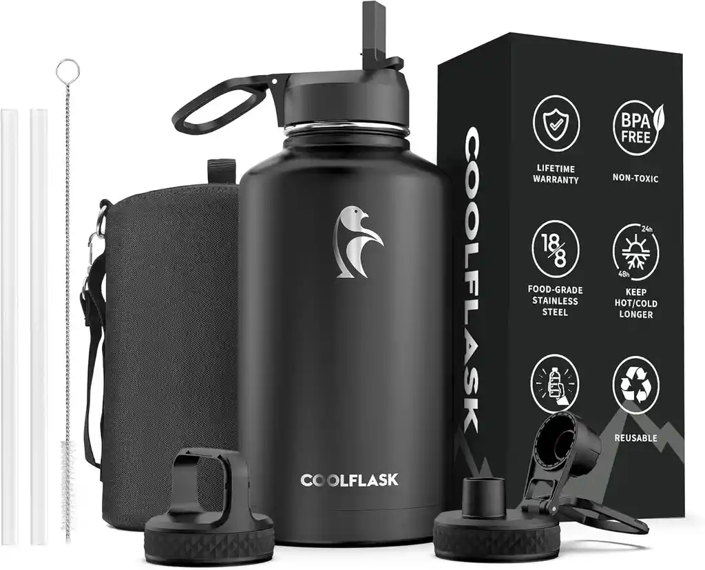 Ecológica: La botella de agua térmica de Coolflask de 64 onzas está construida de acero inoxidable 18/8 (304) que no contiene bisfenol A, es reutilizable y segura para todos. Es resistente al óxido y no absorbe olores. El líquido se mantendrá fresco con el mejor sabor durante todo el día. Bebidas frías por 48 horas y calientes por 24 horas: La tecnología de triple aislamiento de Coolflask tiene una doble pared y es sellada al vacío, mantiene las bebidas frías por hasta 48 horas y calientes por 24 horas. El revestimiento anti condensación mantiene la superficie seca y limpia, hace que sea fácil de agarrar.