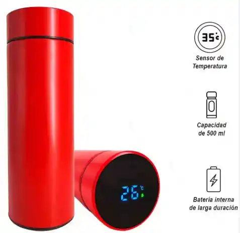 Termo Digital Color Rojo De Acero Inoxidable Capacidad 500ml Disfruta tus bebidas favoritas a la temperatura ideal con este moderno termo digital de acero inoxidable de 500ml. Diseñado para quienes valoran la funcionalidad y el estilo, este termo cuenta con una pantalla LED táctil inteligente que muestra la temperatura interna con solo tocar la tapa. Fabricado en acero inoxidable de alta calidad, garantiza resistencia, durabilidad y conservación térmica por horas. Su diseño hermético y a prueba de fugas lo hace perfecto para llevar café, té o agua a la oficina, la universidad, el gimnasio o tus viajes.