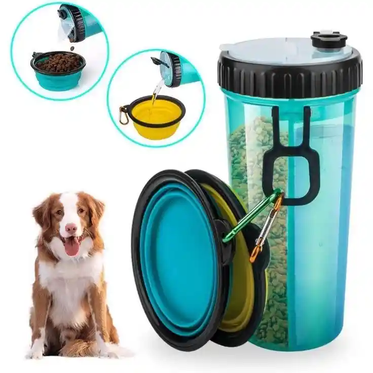 termo doble compartimento, ideal para transportar el agua y la comida a tus mascotas, viene incluido un plato plegable para que sea mas sencillo servirles el alimento. fácil de transportar