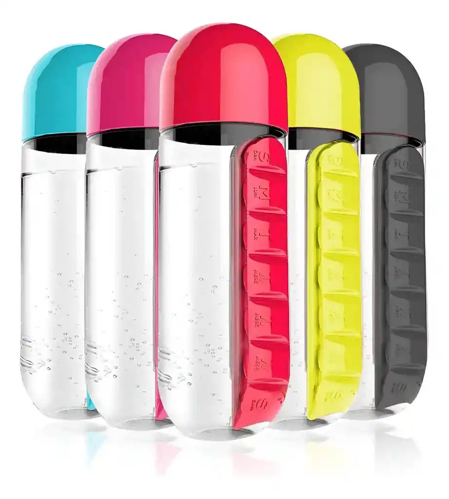 Botella de agua para medicamentos hecha de materiales de alta calidad, sin BPA, inodora, insípida, duradera y a prueba de caídas. Se puede almacenar de forma segura pastillas y agua potable, diseño dos en uno es cómodo de usar. El diseño de tapas extraíbles es conveniente para limpiar el pastillero y rellenar las pastillas. Cada compartimento con tapas interiores y cierre exterior, evita eficazmente que las pastillas se caigan y se mezclen. El cierre exterior se puede cerrar firmemente, no te preocupes de que la funda se abra en tu bolso.