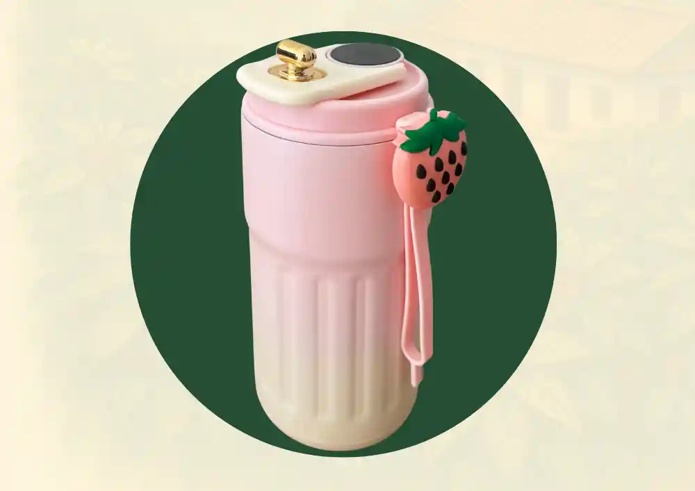 Termo con pantalla digital que indica la temperatura. Conserva el calor por más de 6 horas. Color: rosado degradado con beige.
