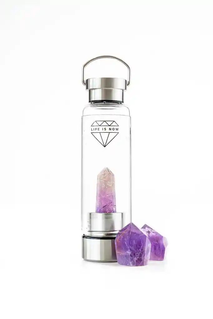 Termo en cristal con obelisco en cuarzo en el interior. Desde hace mucho tiempo se ha usado el agua gematizada por sus propiedades curativas y energéticas logradas a través de los cristales, ellos pueden ayudarnos de manera física, emocional y espiritual, debido a que cada uno tiene su propia vibración y finas curativas. Estas propiedades son transferidas al agua por medio del contacto del cuarzo con ella, ya su vez al nosotros ingerirla recibiremos dichos beneficios. Nuestro cuerpo se compone en un 70% de agua, y esta agua gematizada portadora de dicha energía fluye por nuestro cuerpo llenándonos de ella, haciéndonos vibrar en la misma frecuencia perfecta del cuarzo. Material: Cristal de borosilicato, acero inoxidable, obelisco en cuarzo. Capacidad: 500ml