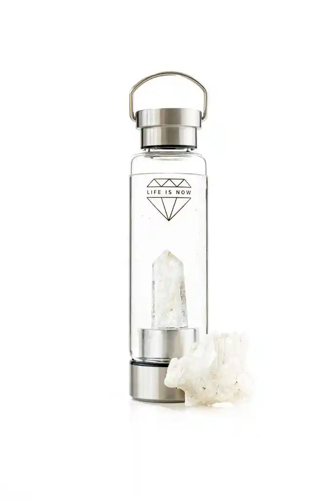 Termo en cristal con obelisco en cuarzo en el interior. Desde hace mucho tiempo se ha usado el agua gematizada por sus propiedades curativas y energéticas logradas a través de los cristales, ellos pueden ayudarnos de manera física, emocional y espiritual, debido a que cada uno tiene su propia vibración y finas curativas. Estas propiedades son transferidas al agua por medio del contacto del cuarzo con ella, ya su vez al nosotros ingerirla recibiremos dichos beneficios. Nuestro cuerpo se compone en un 70% de agua, y esta agua gematizada portadora de dicha energía fluye por nuestro cuerpo llenándonos de ella, haciéndonos vibrar en la misma frecuencia perfecta del cuarzo. Material: Cristal de borosilicato, acero inoxidable, obelisco en cuarzo. Capacidad: 500ml