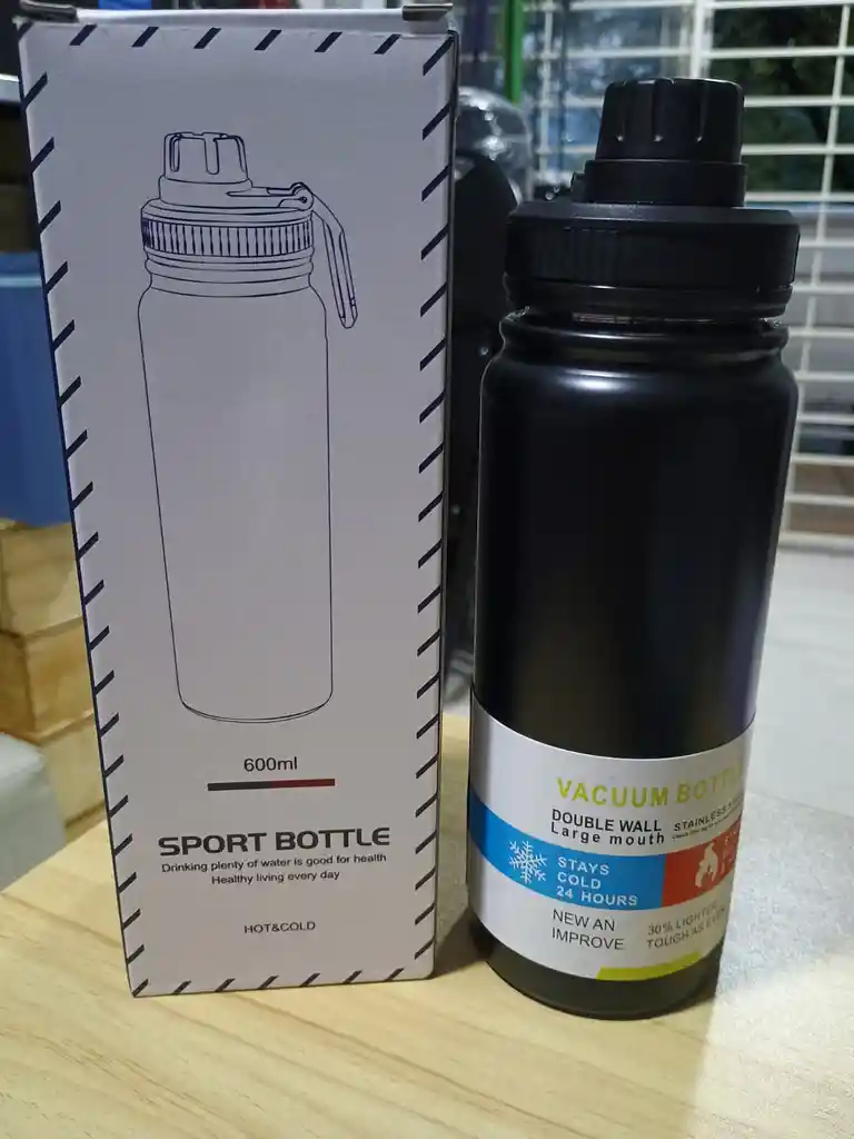 Termo deportivo de 600 ml, adecuada para bebidas frías y calientes. frias por 24 horas Capacidad: 600 ml. Aislamiento: Diseñada para mantener bebidas calientes o frías. Material: Comúnmente fabricada con acero inoxidable de grado profesional 18/8 o aluminio. Uso: Ideal para deportes al aire libre, yoga o uso diario. Características adicionales: a prueba de fugas, boca ancha para facilitar la limpieza o tapas con boquilla deportiva.