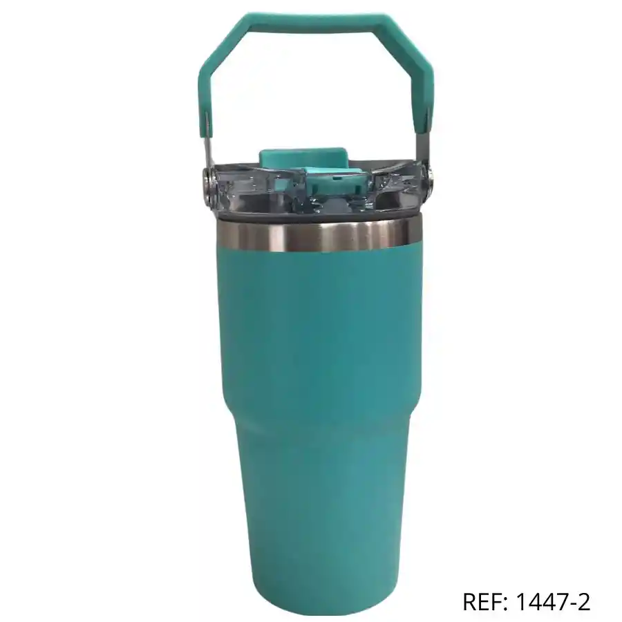 Vaso térmico azul menta con tapa a presión y asa. Ideal para el trabajo, viajes o regalo especial.