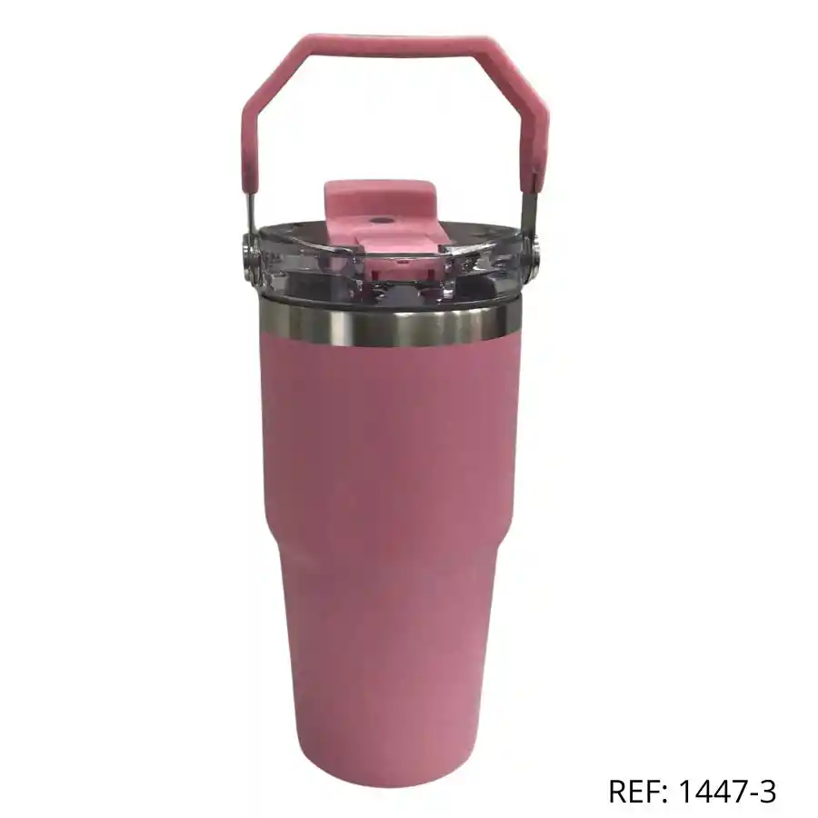 Vaso térmico rosa con asa y tapa transparente. Conserva la temperatura y luce moderno. ¡Perfecto para el día a día!