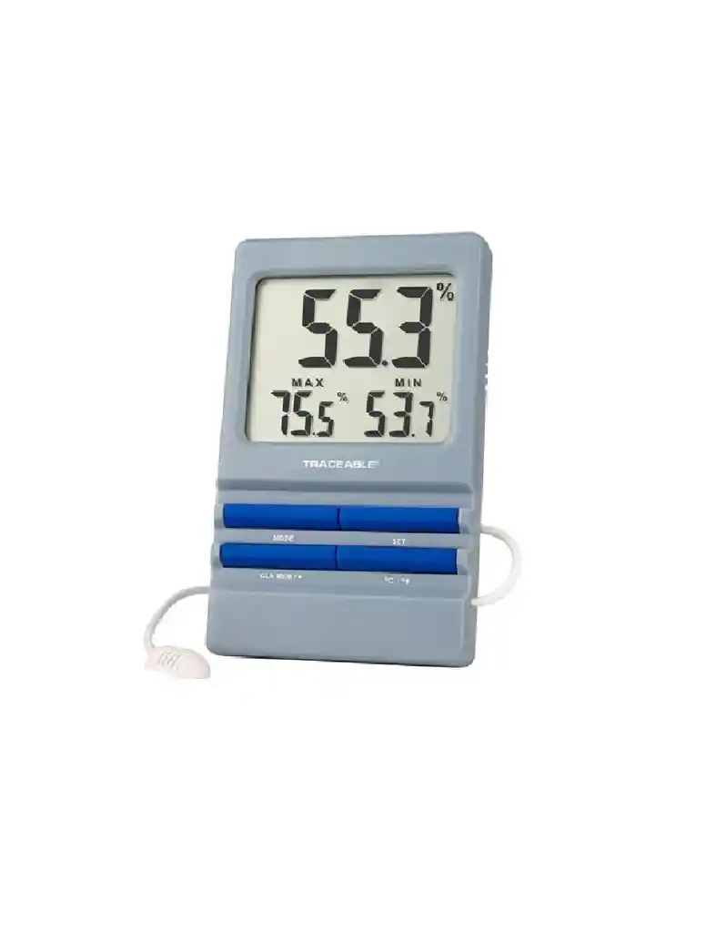 • Rango de Humedad: 5.0 a 95.0%, Resolución 0.1% • Precisión: ± 3% RH desde 25-75%, ± 5% de lo contrario • Rango de Temperatura: 0.0 a 60.0 °C, Resolución 0.1° • Exactitud de la temperatura : ± 0.5 ° C • Tamaño de dígitos LCD: 1/2 pulgada • Longitud sonda: 2 metros. Incluye: Soporte abatible y ranura para montaje en pared, batería AAA para monitoreo continuo de 1 año siempre activo y sensor externo de temperatura/humedad. El estuche de plástico ABS de alto impacto y resistente a productos quimicos. Batería de repuesto N.º de cat. Nº 1105. CERTIFICADO TRAZABLE®: Calibración multipunto en un certificado Traceable® numerado individualmente que garantiza la precisión de nuestro laboratorio de calibración ISO/IEC 17025:2017 (1750.01) acreditado por A2LA. Indica la trazabilidad de las mediciones a las unidades SI a través de NIST u otros institutos nacionales de medición (INM) reconocidos que son signatarios del Acuerdo de Reconocimiento Mutuo CIPM. MEMORIA MÍNIMA Y MÁXIMA: La pantalla muestra tres veces simultáneamente la humedad o la temperatura mínima/máxima y actual. La función de memoria mínima y máxima permite monitorear las condiciones durante la noche, los fines de semana o en cualquier período de tiempo. ALARMA ALTA Y BAJA: suena cuando la lectura sube por encima o cae por debajo de los puntos establecidos.