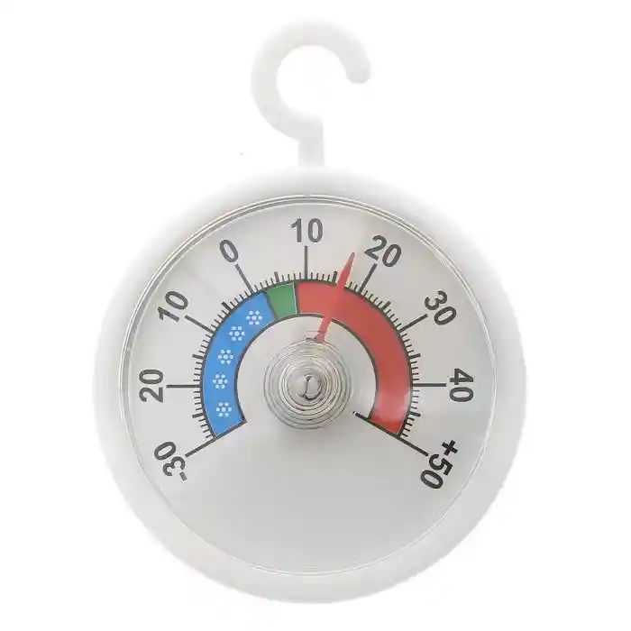 Un termómetro de nevera análogo mediano es un dispositivo para monitorear la temperatura dentro de un refrigerador o congelador, que funciona de manera mecánica con un dial.