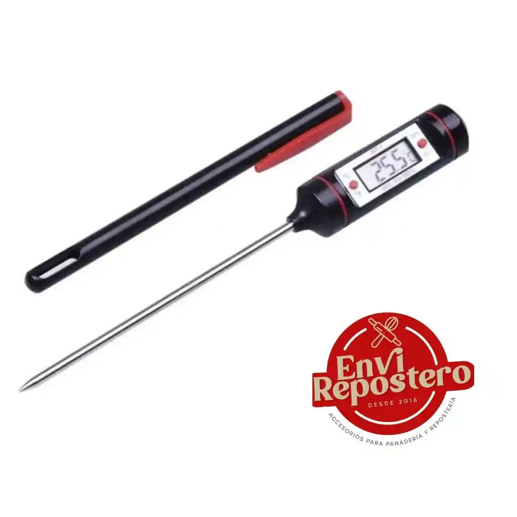 Termómetro digital (rangos de temperatura -50grados centígrados + 300 grados centígrados), Dimensiones 19x2cm.