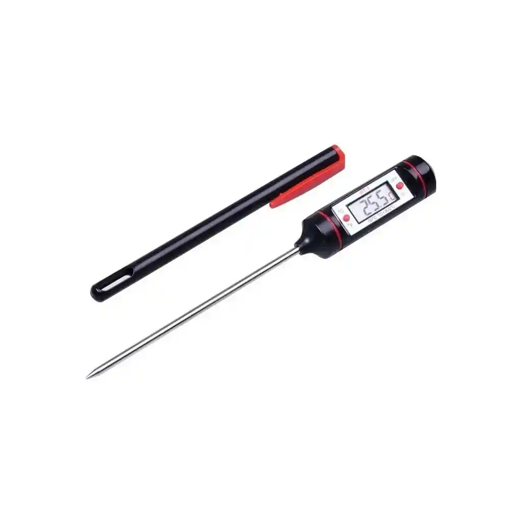 Sonda en acero inoxidable resistible. Adicional estuche para proteger sonda . Ideal para medir la temperatura interna de carnes. Pulse la tecla [ON / OFF] para encender / apagar el termómetro. Rango de temperatura: -50°C + 300°C (58° F + 572F). Velocidad de distinción: 0,1°C (<100°C); 0,5ºC (>100ºC) . Precisión: (-20° / 80°C) + - 1°C . Voltaje de la energía: DC 1.5V . Con apagado automático después de 15 min. Cambia entre °C y F°. Resistente al uso continuo. No absorbe olores ni sabores. Apta para uso doméstico o profesional. La imagen ha sido ambientada; no incluye accesorios adicionales y el color puede variar según la iluminación.