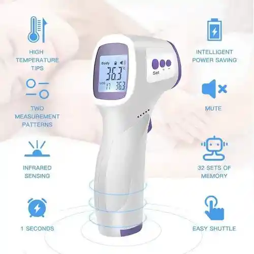 Descripcion: Este termómetro es rápido y seguro, diseño agradable con exclusivo display retroiluminado y de muy fácil lectura, también te mide la temperatura de alimentos, o la temperatura de una habitación. Es ideal para el hogar servicios médicos, jardines maternales y colegios, ya que puede realizar hasta 30 mediciones en un minuto. Posee alarma que sonará ante elevada temperatura corporal febril. Caracteristicas: - Distancia de medición de 3 – 5cms. - Apagado automático: 5 segundos sin operación ahorrando batería. - Rápido: Tiempo de medición: 0.5 segundos. - Precisión: ±0.3 ºC (0.6ºF). - Batería de larga duración. - Medición de temperatura corporal y de superficies. - Funciona con dos baterías AAA (No incluidas). - Pantalla LCD. - Temperatura de funcionamiento: 10º – 50ºC. - Medición ºC y ºF.