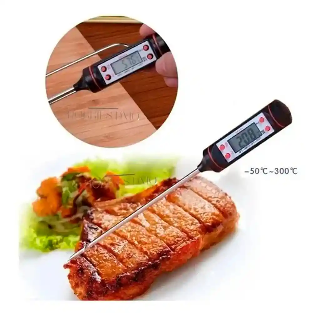 Termómetro Digital MOSEKO de Cocina Para Alimentos Carne/Agua/ Horno BBQ Con Sonda Electrónica Termómetro hogar Herramienta de Cocina -Rango de medida: -50°C -- 300°C -58°F -- 572°F -Precisión de la temperatura: ±1°C/°F -Modo de ahorro de energía: 10 minutos de función de apagado automático -Fuente de alimentación: 1,5 V (AG13) (no incluye) -Guarda en la memoria la última medida de temperatura. -Sistema de medición por grados Centígrados o Fahrenheit. -Teclas de encendido/apagado: conmutación Llave máxima para ver el máximo/mínimo Especificación: Marca: MOSEKO Color: Negro Longitud: 238mm Peso neto: 23g Sonda de acero inoxidable Largo y cómodo estuche Es un termómetro para Alimentos, Ideal para medir la temperatura interna de carnes, cocciones, bebidas, dulces o cualquier alimento en el que se pueda usar método de punzón. Paquete Incluye: 1 Termómetro Digital (batería incluye) 1 Instrucción