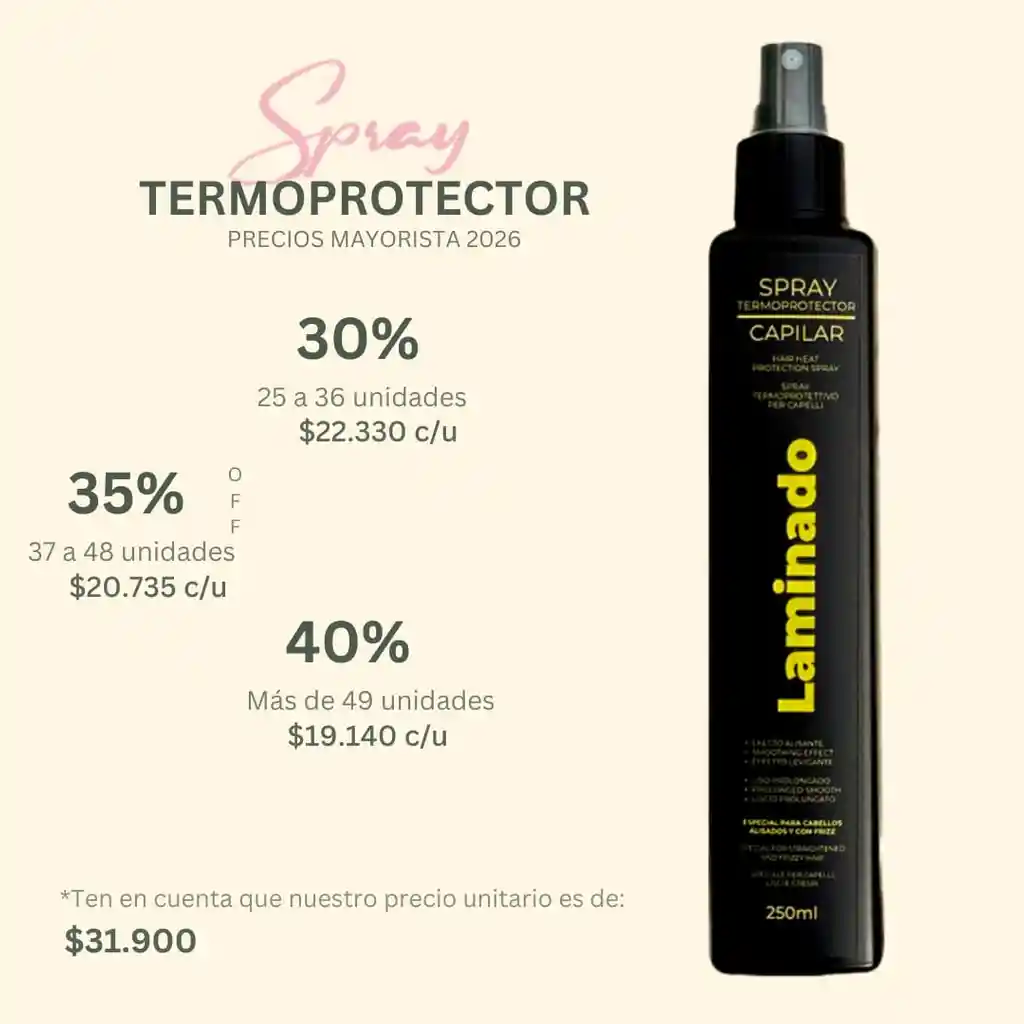 TERMOPROTECTOR CAPILAR LAMINADO 250 ML : protege la fibra capilar de las altas temperaturas (plancha, secador, rizador), creando una barrera que sella la cutícula, reduce el frizz, aporta brillo intenso y facilita el peinado. Además, ayuda a mantener el cabello hidratado, disciplinado y prolonga la duración de alisados o keratina. Beneficios Principales del Termoprotector Laminado: * Protección Térmica: Crea una barrera invisible que protege contra el daño de herramientas de calor. * Efecto Laminado/Brillo: Cierra las cutículas, reflejando la luz para un brillo radiante. * Anti Frizz y Disciplinante: Facilita el peinado, reduce el encrespamiento y disciplina el cabello. * Hidratación y Suavidad: Aporta nutrición, evitando que el cabello se vea seco o quebradizo. * Reparación: Ayuda a tratar puntas abiertas y fortalecer la estructura capilar. * Prolongación del Peinado: Ayuda a que el alisado o peinado dure mucho más tiempo. Es ideal para todo tipo de cabello, especialmente aquellos debilitados o tratados con químicos, gracias a su textura ligera que no aporta grasa.