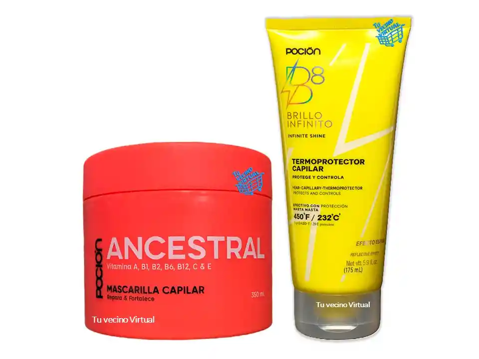 En tu vecino virtual también encontraras : Anyeluz, syam cosmetic, piel de oro, Kaba, class gold, lampiña, Te verde de matcha Benefit, te plus, te latte, te negro, exfoliante, aceite de coco, pomada alfa, colageno hidrolizado,vinipel osmótico, Bioaqua Acne, Mascarillas,tónico, Trendy, la pocion, HGW y muchos mas ————————————————————————————————————————————————— ----------------------------------------------------------------------------------------------------- Termoprotector Capilar Brillo Infinito Pocion B8 Termoprotector, nos brinda la riqueza de la gran biodiversidad amazónica plasmada en los activos más poderosos para crear una auténtica mezcla de alta afinidad, capaz de proporcionar un sensorial superior y cuenta con hidratantes de alta tecnología que neutralizan el impacto del calor. Modo de uso: Aplica B8 termoprotector en las palmas de tus manos dependiendo de la abundancia y longitud de tu cabello. Toma porciones de cabello y aplica hacinedo énfasis en las puntas hasta llegar a la raíz para un total cubrimiento. Luego, seca de la forma que prefieras ( al natural o secador ) al finalizar procede a realizar tu planchado hasta obtener el resultado deseado. Contenido 175 ml ——————————————————————————— Mascarilla Ancestral la poción ANCESTRAL con alto poder reestructurante, hará que cada fibra rota de tu cabello se una nuevamente, mejorando visiblemente su apariencia, ayudará a prevenir el daño futuro, formando un escudo protector en cada hebra, incrementará la fuerza, promoverá el crecimiento y disminuirá la caida. Mascarilla ANCESTRAL fue creada para cabellos sobreprocesados de todas las texturas y para los que deseen mejorar y llevar sus hebras a otro nivel de belleza y salud. Contiene: 350 mL Invima :NSOC09996-21CO