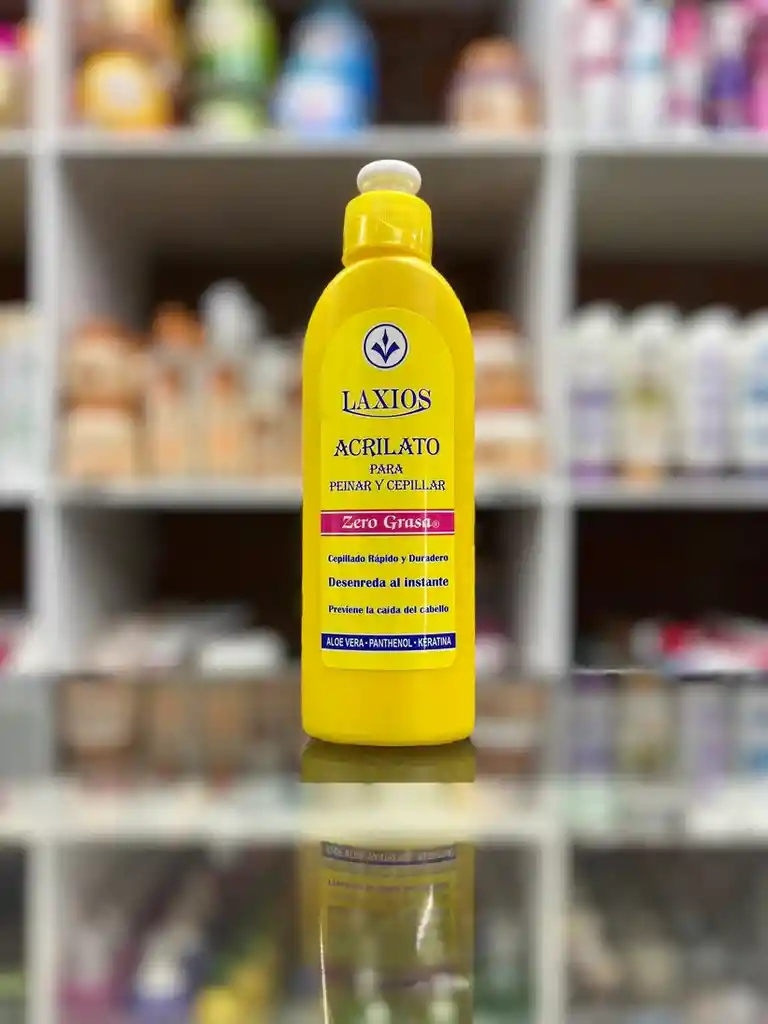 Ideal para obtener un peinado rápido, flexible, natural y duradero. Puede usarse diariamente. NO CONTIENE GRASA. Máximo desenredante: Desenreda al instante, por lo tanto previene la ruptura y caída del cabello causada por la tracción o halamiento al peinar o cepillar, la cual es una de las principales causas de pérdida de cabello en la mujer. Óptimo control del frizz, brillo extremo al instante, protege la fibra capilar, previene la horquilla, excelente sellador de cutícula y liso intenso. Su perfume deja agradable sensación de limpieza. Contiene filtro solar. Cepillado duradero: El cepillado con Acrilato laxios es muy duradero debido a sus componentes que repelen la humedad del ambiente. Sellado de puntas: para atenuar o desaparecer el aspecto horquillado o poroso de las puntas de su cabello, aplicar cantidad suficiente sobre estas. Protección: Este producto brinda protección especial a los cabellos tinturados o procesados con agentes químicos, porque forma una película protectora sobre la fibra capilar que permite que los cepillos, peines y planchas deslicen de forma suave, rápida y eficaz evitando la abrasión o desgaste que causa la acción de éstos. Previniendo que el cabello se quiebre o se parta. Nutre el cabello: Enriquecido con Aloe Vera, Keratina y Panthenol que hidrata, nutre, fortalece y da vigor a la fibra capilar previniendo su caída. Planchado: Cuando utilizamos Acrilato Laxios para planchar el cabello, éste disminuye los daños causados por la plancha y ésta operación dura la mitad del tiempo. Modo de uso: Aplique sobre el cabello húmedo o seco y proceda a peinar, cepillar o planchar. No enjuagar.