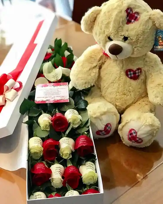 caja larga 12 rosas con peluche pequeño
