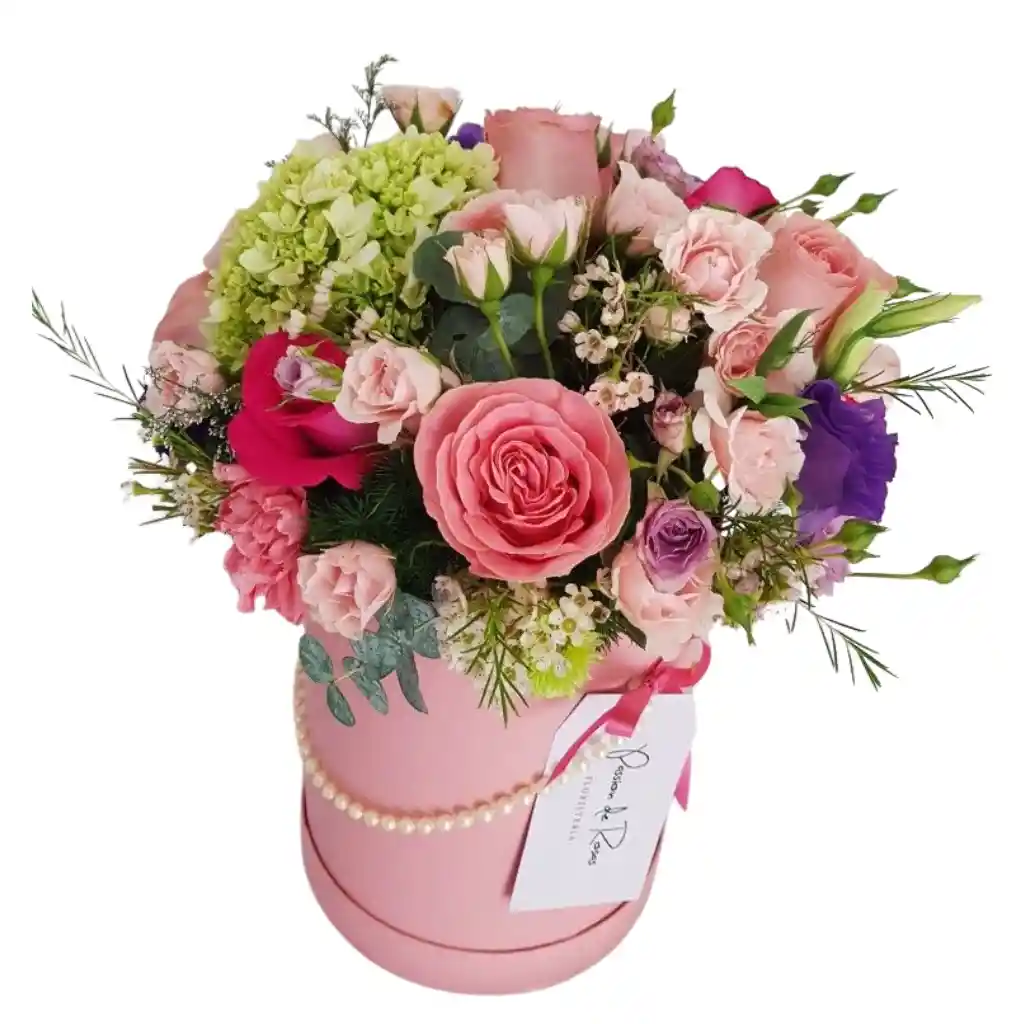 Caja 6 rosas rosada,s 6 rosas mini rosa ,3 ortencias 4 goetias eucalipta