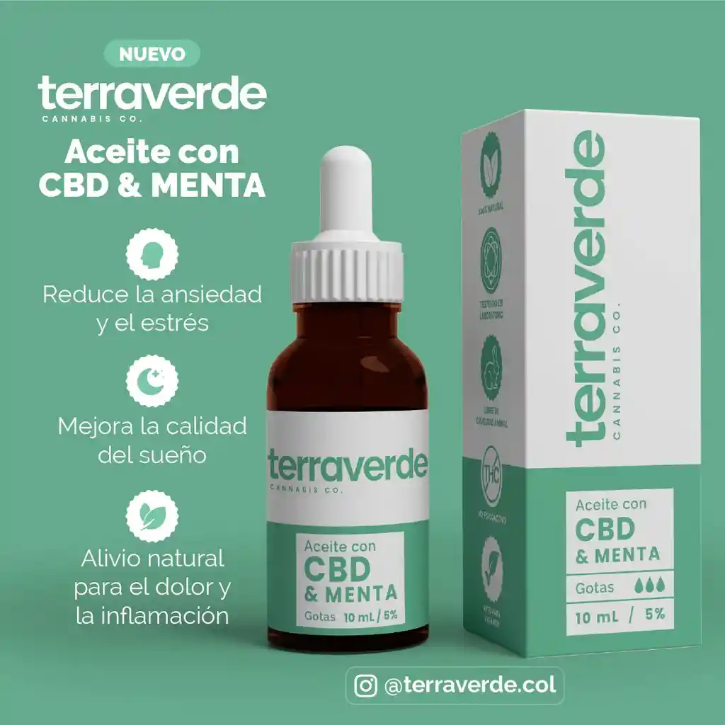 Aceite con CBD y Menta 10 ml Terraverde gotas 5%. Modo de uso: agitar bien antes de usar, aplicar entre 5 y 10 gotas en la zona del cuerpo que lo requiera y frotar suave. Detalles del producto INVIMA NSOC30085-24CO