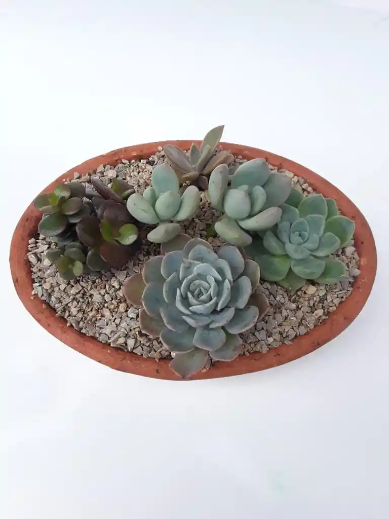 Terrario ovalado con 5 especies diferentes de suculentas requieren sol directo o sombra parcial con excelente iluminacion riego una vez por semana.