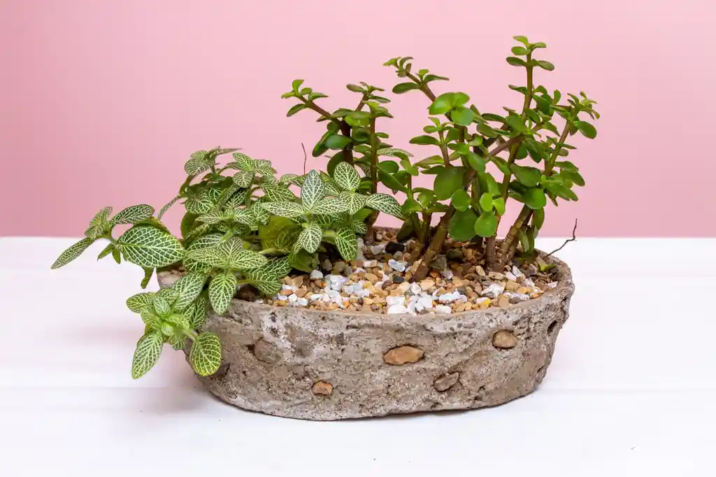 Este bello terrario combina de manera armoniosa la vitalidad del Abrecaminos (Fittonia) y la fortaleza del Jade Hembra (Crassula ovata 'Minor' o variedad de hojas pequeñas) en una atractiva matera de piedra de aspecto rústico, con grava que cubre la superficie del sustrato. La selección de estas plantas es especialmente significativa: el Abrecaminos es reconocido por su simbolismo de éxito, prosperidad, superación de obstáculos y la apertura a nuevas oportunidades y buenos rumbos en la vida, atrayendo optimismo y buena suerte. Por su parte, el Jade (conocido también como la "planta del dinero" o "árbol de la abundancia") es un poderoso símbolo de prosperidad, buena fortuna, riqueza y longevidad en el Feng Shui, cuyas hojas carnosas se asemejan a monedas, y cuya presencia en el hogar o negocio se cree que atrae energía positiva y bienestar económico. Al unirse, estas plantas crean un amuleto vivo que no solo decora, sino que se carga de intenciones positivas para el camino y la prosperidad del dueño. Recuerda que los cuidados específicos para mantener estas plantas saludables se entregan detalladamente con tu compra.
