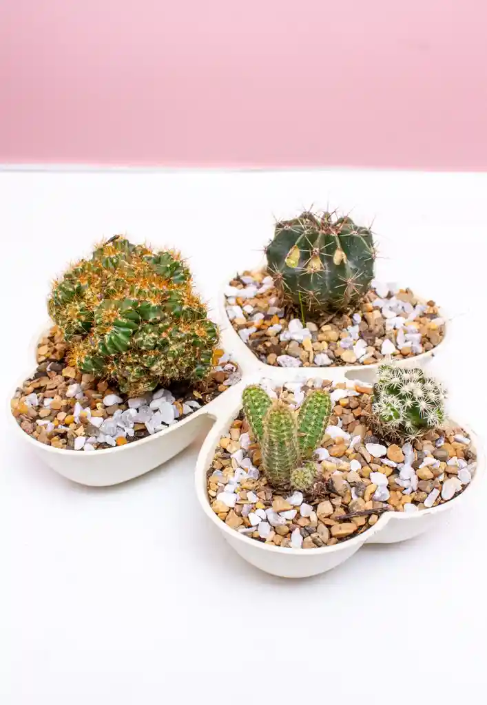 Añade un toque de frescura y estilo con esta matera de corazoncitos, que contiene tres compartimentos perfectos con tres cactus medianos. Ideal para cualquier espacio, estas plantas de bajo mantenimiento son el regalo perfecto para dar vida a tu hogar u oficina. ¡Sencillez, belleza y naturaleza en un solo detalle!