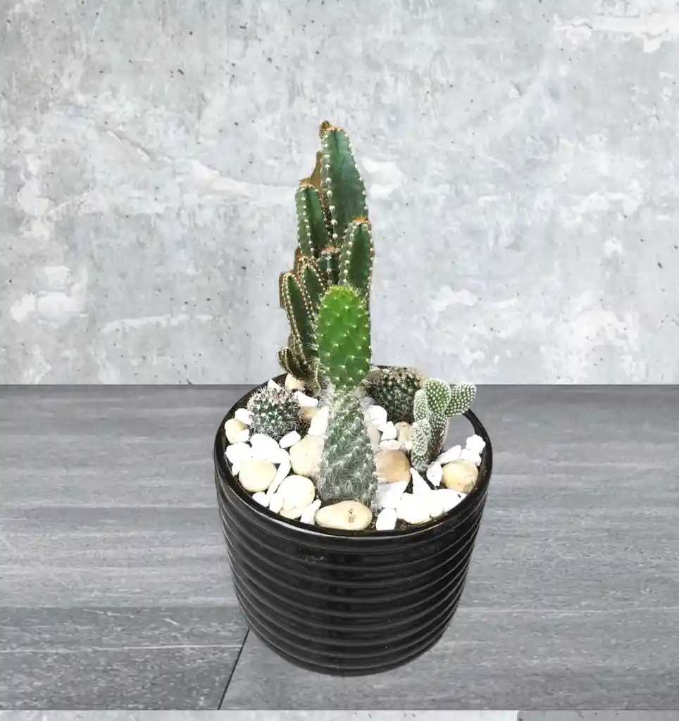 El Cactus tiene facilidad de cultivo, su bajo mantenimiento y el gran número de variedades y tipos disponibles. Sus características han convertido a estas plantas suculentas en todo un fenómeno de masas. Encantador Jardín que viene en matera diseño ceramica color negro. Está decorada con arena y piedras naturales que realzarán su belleza. Decora tu Hogar con este pequeño mundo.
