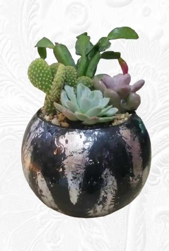 Un terrario es un pequeño jardín que se cultiva dentro de un ambiente cerrado. En pocas palabras, es un invernadero en miniatura. El objetivo de ellos es poder reproducir artificialmente las condiciones de un hábitat en específico y generar el ambiente ideal para que la vegetación de nuestra elección pueda vivir ahí. Encantador Jardín que viene en matera de plástico plateada, suculentas y cactus seleccionadas. Está decorada con arena y piedras naturales que realzarán su belleza. Decora tu Hogar con este pequeño mundo.