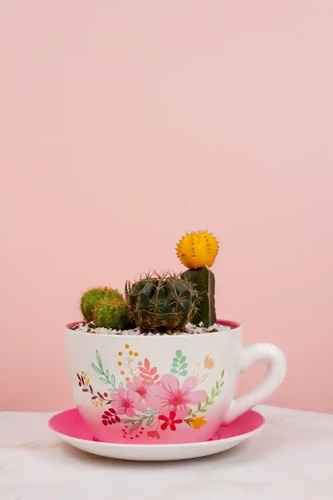 Este terrario es una verdadera obra de arte que combina la resistencia de los cactus con la delicadeza de la cerámica. El arreglo está plantado en una preciosa taza de gran tamaño y plato a juego, adornada con un delicado patrón de flores en tonos rosas, menta y coral que resalta sobre un fondo blanco inmaculado. En su interior, una selección curada de cactus crea un contraste fascinante: desde el vibrante y esférico cactus amarillo sol que se alza como protagonista, hasta las texturas más ásperas y oscuras de los compañeros verdes. Es el regalo perfecto para quienes aman la naturaleza, pero tienen poco tiempo. Un detalle que permanece, florece con un mínimo de cuidado y añade un toque de color y personalidad a cualquier hogar u oficina. Simplemente, un sorbo de naturaleza y dulzura.