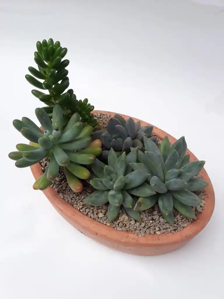 Terrario ovaldo con cuatro especies diferentes de suculentas requieren sol directo o sombra parcial riego una vez por semana.
