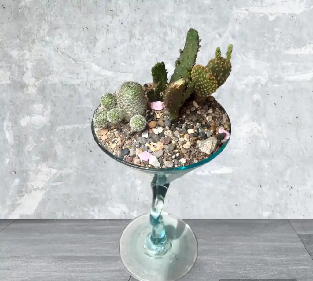 Un terrario es un pequeño jardín que se cultiva dentro de un ambiente cerrado. En pocas palabras, es un invernadero en miniatura. El objetivo de ellos es poder reproducir artificialmente las condiciones de un hábitat en específico y generar el ambiente ideal para que la vegetación de nuestra elección pueda vivir ahí. Encantador Jardín que viene en matera ovalada en forma de copa con tres tipos Cactus seleccionadas. Esta decorada con arena y piedras naturales que realzarán su belleza. Decora tu Hogar con este pequeño mundo. Al momento de la compra ofrecemos al cliente una ficha Técnica con los cuidados y curiosidades.