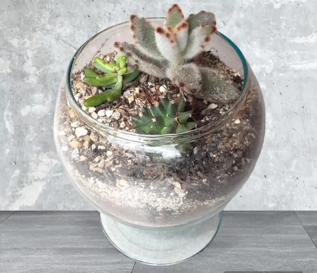 Un terrario es un pequeño jardín que se cultiva dentro de un ambiente cerrado. En pocas palabras, es un invernadero en miniatura. El objetivo de ellos es poder reproducir artificialmente las condiciones de un hábitat en específico y generar el ambiente ideal para que la vegetación de nuestra elección pueda vivir ahí. Encantador Jardín que viene en matera ovalada en forma de copa pequeña con dos tipos de suculentas y un cactus seleccionadas. Esta decorada con arena y piedras naturales que realzarán su belleza. Decora tu Hogar con este pequeño mundo. Al momento de la compra ofrecemos al cliente una ficha Técnica con los cuidados y curiosidades.