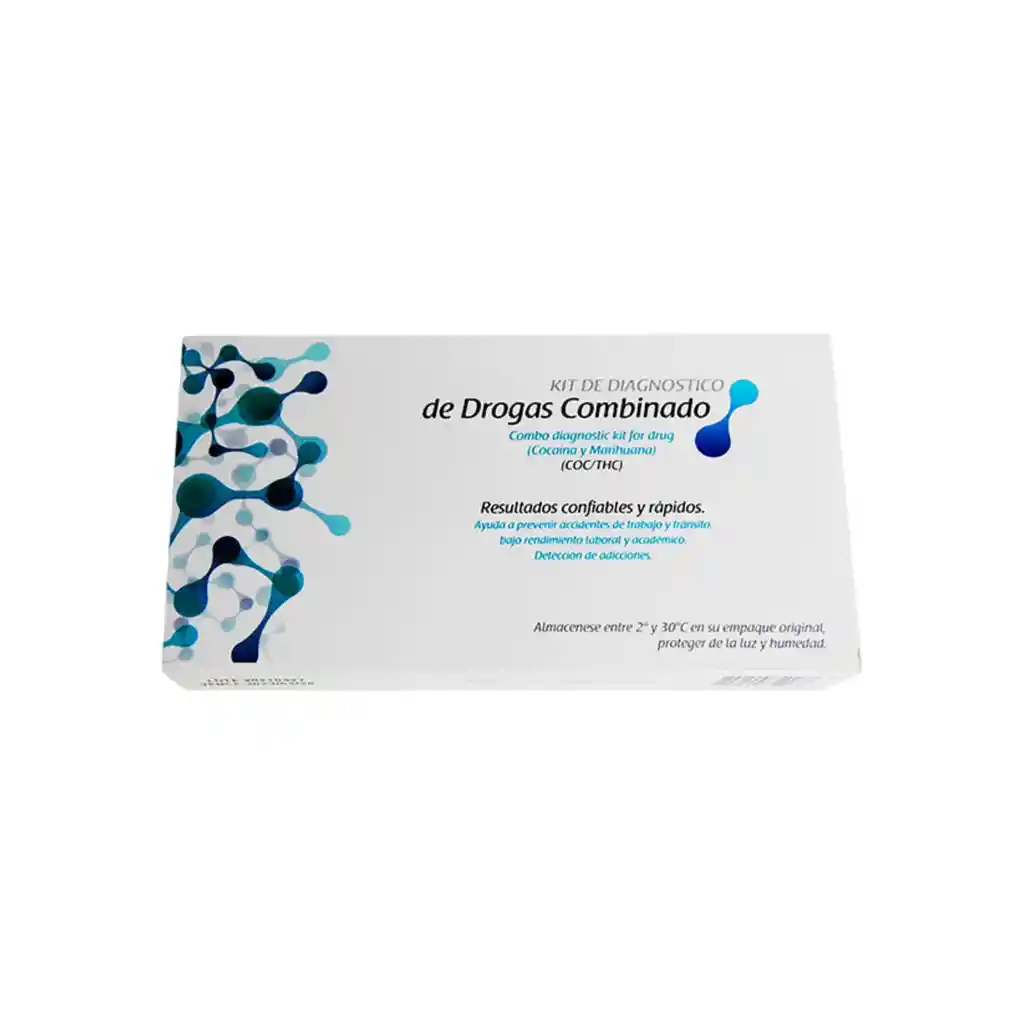 Test de diagnostico para control de consumo de drogas 2 en 1, indicado para disgnosticos de mairhuama y cocaina. Modo Uso: Tomar un recipiente para almacenamiento de orina luego de obtener la muestra de orina sumerja las bandas hasta el limite antes de empezar el cuerpo de plastico de la prueba. Resultados: Positivo= si tiene una linea 1-C, Negativo= si tiene dos lineas 1-C y 1-T, Invalida= si no tiene lineas en ninguno de los indicadores C Y T o Si muestra una linea en 1-T para estos casos la prueba debe repetirse.