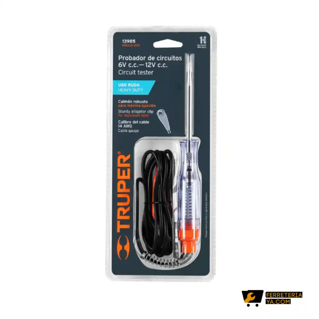 Ideal para medición de corriente directa en baterías y circuitos de 12 V Punta de acero al carbono y mango de plástico transparente aislado para mayor seguridad Cable con caimán para tierra. Especificaciones Corriente directa (C.D.) 6 - 12 V Largo total 20 cm Largo del cable 1.5 m Empaque individual Blíster