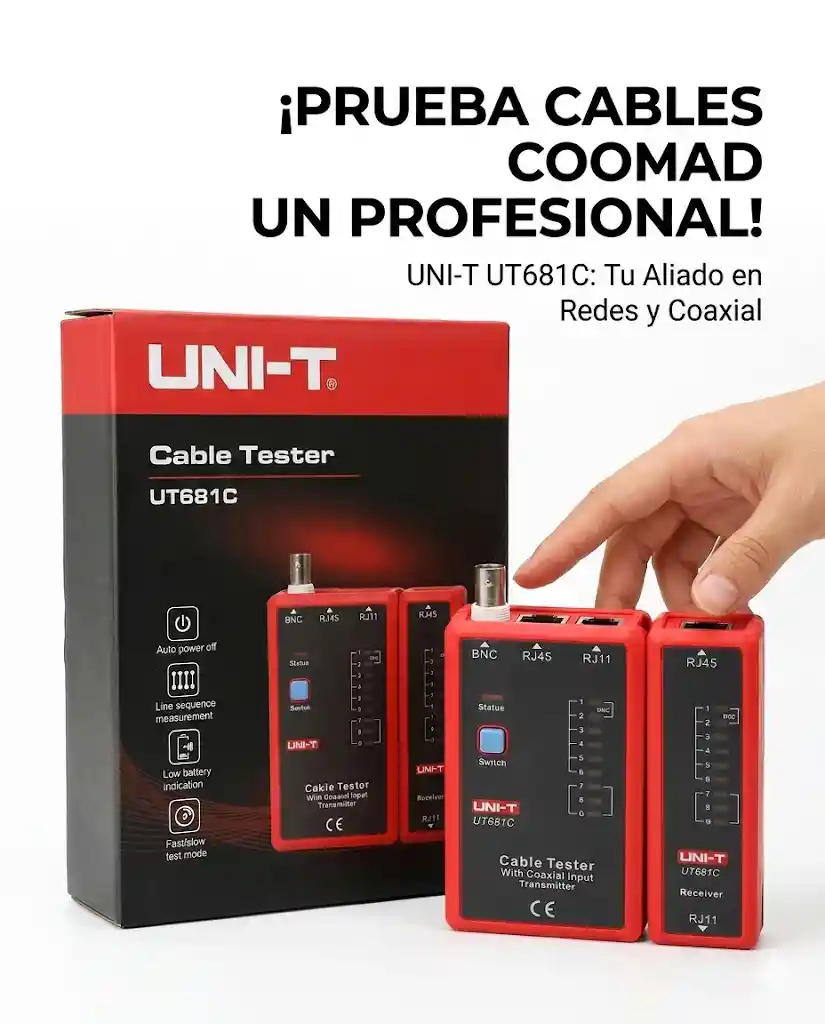 🛠️ ¡Diagnósticos Precisos en Segundos: Tester de Red Uni-T UT681L! ⚡ ¿Cansado de perder horas buscando un fallo en el cableado? No adivines más. El Tester de Red Uni-T UT681L es la herramienta profesional que todo instalador de cámaras, redes o telefonía debe tener en su maletín. Detecta errores de conexión al instante y garantiza entregas de proyectos impecables. ¿Cómo funciona? 🧐 Este probador está diseñado para un flujo de trabajo rápido y sin errores: Escaneo Automático: Solo conecta ambos extremos del cable (RJ45 o RJ11) al emisor y receptor. El dispositivo realizará un barrido LED secuencial. Identificación de Fallos: Los indicadores LED te mostrarán de forma visual si hay continuidad, cables cruzados, circuitos abiertos o cortocircuitos. Modos de Velocidad: Cuenta con un interruptor para cambiar entre prueba rápida y prueba lenta, permitiéndote analizar cada pin con total detalle. Lo que lo hace único: ✨ Compatibilidad Universal: Diseñado para probar cables de red CAT5, CAT6 y CAT7 (RJ45) y cables telefónicos (RJ11) con total precisión. 🛡️ Calidad Uni-T: Marca líder en instrumentación construcción robusta que soporta el uso rudo en campo y caídas accidentales. 🔋 Batería de Larga Duración: Circuito optimizado para bajo consumo de energía (requiere batería de 9V), ideal para jornadas largas de instalación. 📏 Diseño Modular: El receptor se separa del emisor principal, permitiéndote probar cables ya instalados en paredes o techos de hasta 300 metros. 🚀 Portabilidad Extrema: Compacto y liviano, cabe en cualquier bolsillo o estuche de herramientas sin ocupar espacio. 📍 Atención inmediata en Medellín. ¡Asegura tus conexiones y evita garantías innecesarias hoy mismo!