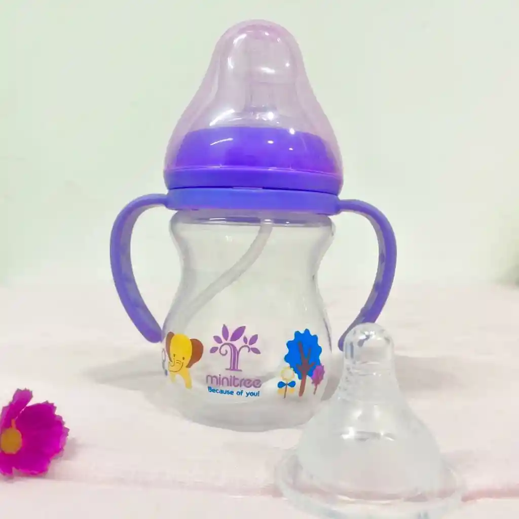 TETERO 6 ONZ ASAS Y CHUPA PITILLO CON VALVULA MINITREE El set incluye una chupa de silicona con válvula, ideal para líquidos como el jugo, chupa clásica y el biberón cuenta con asas para facilitar el agarre del bebé.