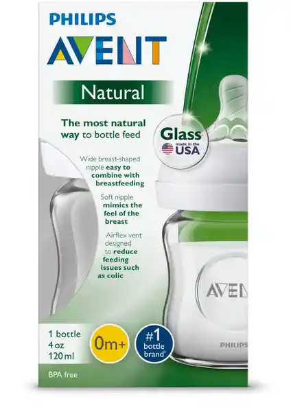 La Botella de Vidrio Avent Natural de 4 Onzas es la Forma Más Natural de Alimentar Con Biberón. El Pezón Ancho en Forma de Seno en el Biberón Natural Promueve el Enganche Natural Para Que Pueda Combinar Fácilmente la Lactancia Materna y el Biberón. El Pezón Ultra Suave Imita la Sensación Del Seno. Nuestro Diseño Espiral Flexible Combinado Con Los Pétalos Confortables Permiten un Movimiento Natural Mientras se Alimenta al Bebé. Los Biberones Tienen Una Tecnología de Ventilación Air Flex Única Integrada en el Pezón y Están Diseñados Para Reducir Los Cólicos y Las Molestias al Ventilar el Aire Lejos de la Barriga de su Bebé. La Forma Ergonómica Hace Que Sea Cómodo Para Los Padres Sostenerlo y Que Los Dedos Pequeños Puedan Agarrarlo Fácilmente. El Montaje es Simple Con Solo Unas Pocas Piezas y el Cuello Ancho de la Botella Facilita el Llenado y la Limpieza. Esta Botella de Avent Natural Está Hecha de Vidrio de Borosilicato de Primera Calidad un Material Libre de Bpa. Es Resistente al Calor y al Choque Térmico Por lo Que Puede Almacenarse de Forma Segura en el Refrigerador Calentarse y es Fácil de Lavar y Esterilizar. Funciona Con Todos Los Pezones y Tapas de la Línea Natural. Características: -La Forma Más Natural de Alimentar Con Biberón la Forma Natural Del Pezón y la Sensación Ultra Suave Facilitan Que el Bebé se Combine Con la Lactancia Materna