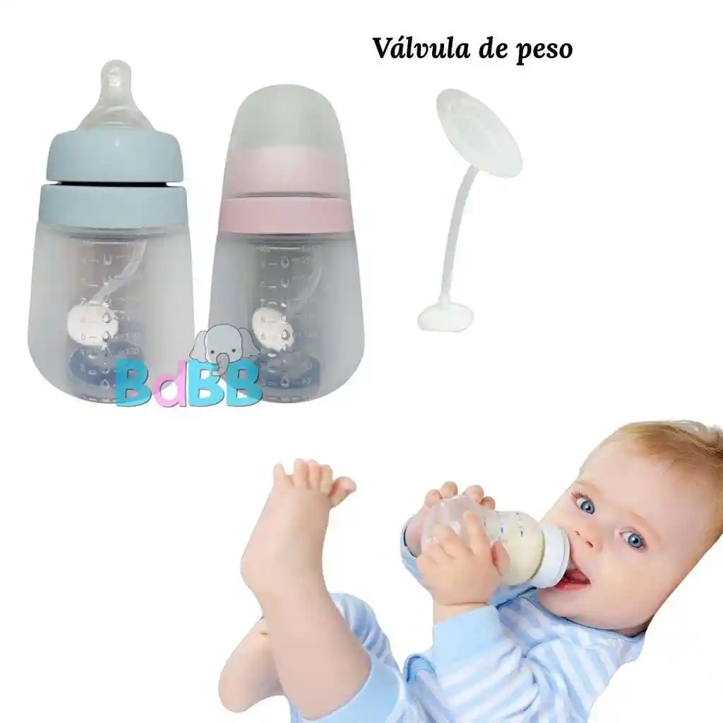 Útil biberón en silicona con válvula de peso. El peso facilita que el bebé tome líquido en cualquier posición incluso recostado el peso se dirige haca donde va el líquido, lo cual facilita que el bebé/niñ@ tome hasta la última gota. Suave de fácil agarre, recomendado desde los 3 meses. Capacidad de 9onz Libre de BPA