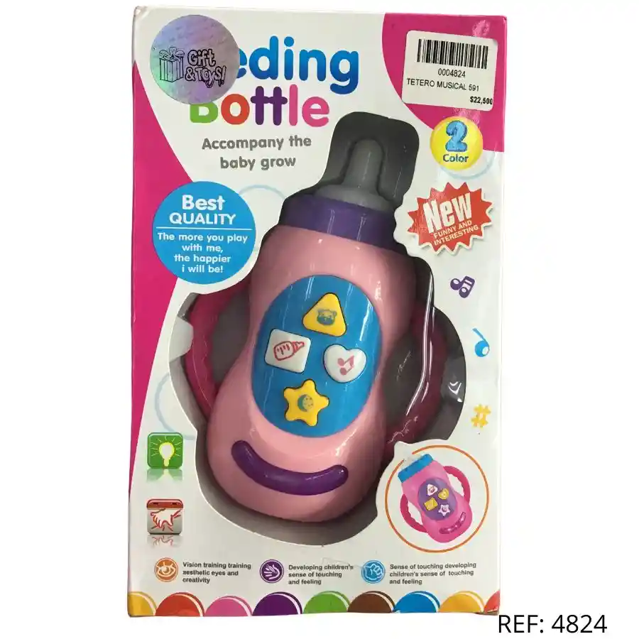 Tetero musical interactivo. Emite sonidos y luces. Estimula los sentidos y la diversión del bebé.