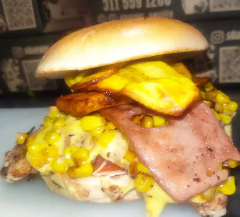 180 gramos de carne artesanal Tocineta ahumada Plátano maduro Maíz tierno Aguacate Queso de la casa Vegetales frescos Papas a la francesa